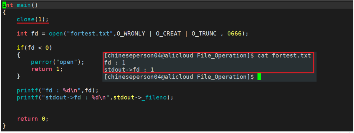 - 这是因为printf只认stdout,stdout的描述符又为1,与其说printf只认stdout,不如说printf只认文件描述符为1的文件,printf并不会管文件描述符表中的数组内容是如何变化的,它只会将数据写入到文件描述符为1的文件中。这里我们将标准输入关闭,新打开的文件文件描述符就是1,所以printf将数据写入到新文件中,并且新打开文件的文件描述符为1,符合fd的分配规则。
