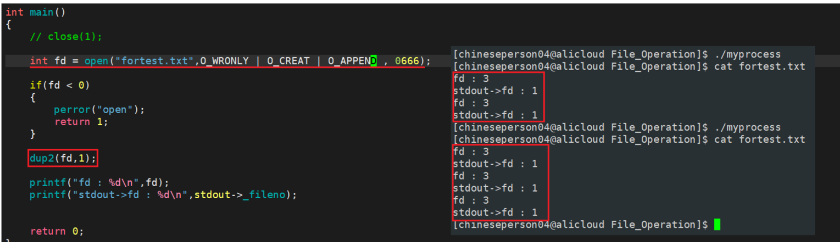 - 在上面讲述fd的分配规则时,我们分别将文件标识符为0和2的文件关闭后,在新打开一个文件,这里我们将表示文件标识符为1的文件关闭后,然后再新打开一个文件,最后输出一段数据,运行进程观察现象,我们发现本应该显示在显示屏上的数据,最后却写入到了这个被新打开的文件中?
