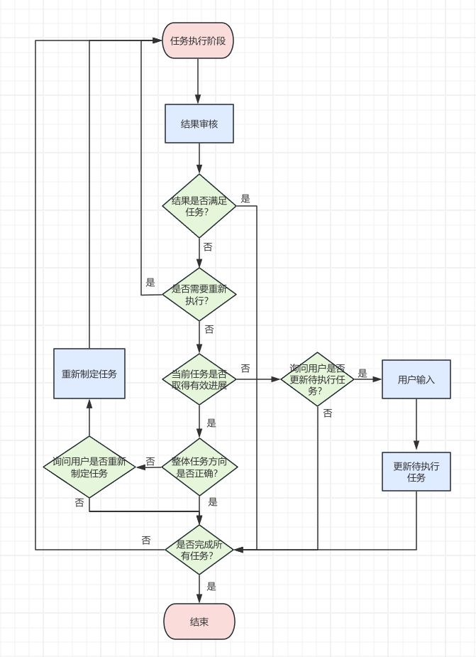 在多智能体(Multi-Agent)系统的设计与应用过程中,结果审核、评估以及任务的动态调整是确保任务最终取得理想成果的关键环节。当某项任务执行完毕后,系统会对其结果进行多层次、多维度的审核与评估。首先,通过自动化的判定机制,系统会检测任务结果是否达到了预期目标,并分析其中可能存在的问题或不足。根据评估结果,系统能够灵活采取多种应对措施,包括但不限于:自动重新执行当前任务以修正错误,对后续待执行任务进行动态调整以适应新的任务状态,允许用户手动干预和调整任务流程,甚至对所有相关任务进行整体更新。此外,系统还支持用户根据实际需求追加新的任务,从而保证任务链条的持续优化和高效推进。通过上述多重机制,Multi-Agent系统能够有效应对任务执行过程中出现的各种不确定性和变化,确保每一项任务都能取得实质性进展。整体的流程如下所示: