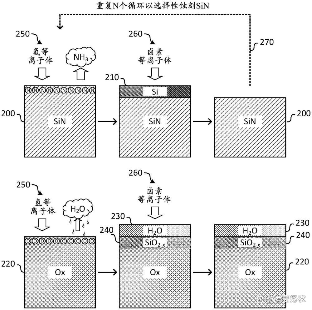 两步循环设计:步骤1,氢等离子体改性氮化硅表面,形成活性层;同时在氧化硅表面生成结晶水保护膜。步骤2,卤素等离子体选择性刻蚀改性氮化硅,氧化硅因水膜保护无损。
