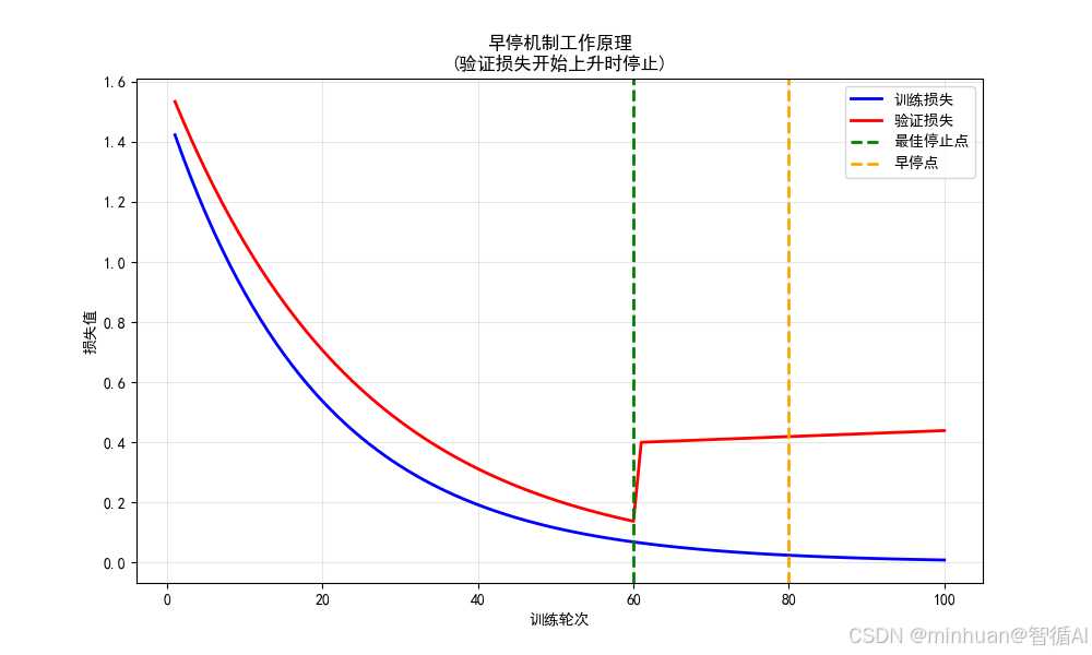 - 橙色停止点虚线:早停机制实际触发的停止点