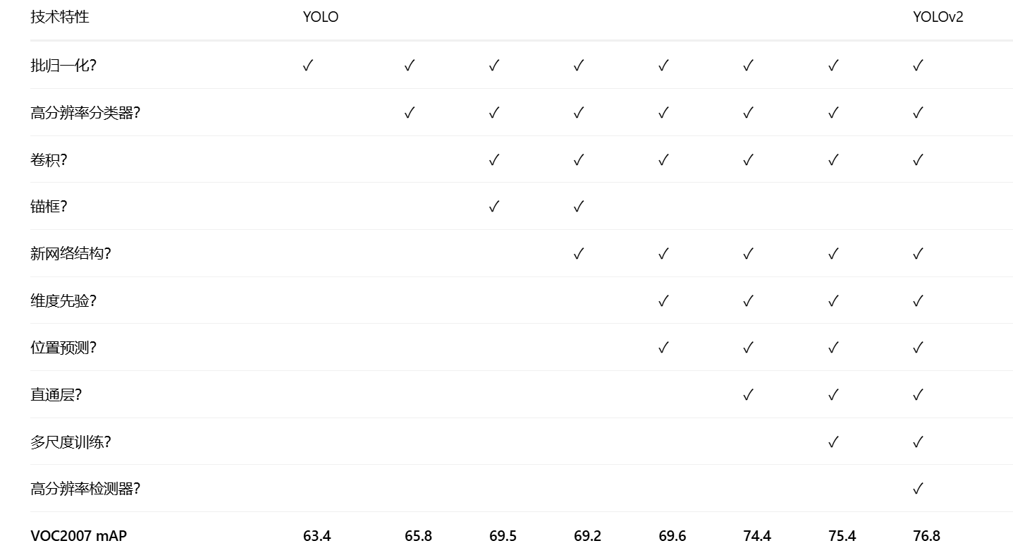 这张对比表格清晰地展示了从YOLO到YOLOv2的渐进式改进过程。表格从左到右显示了不同技术特性的引入顺序及其对检测精度(mAP)的影响。