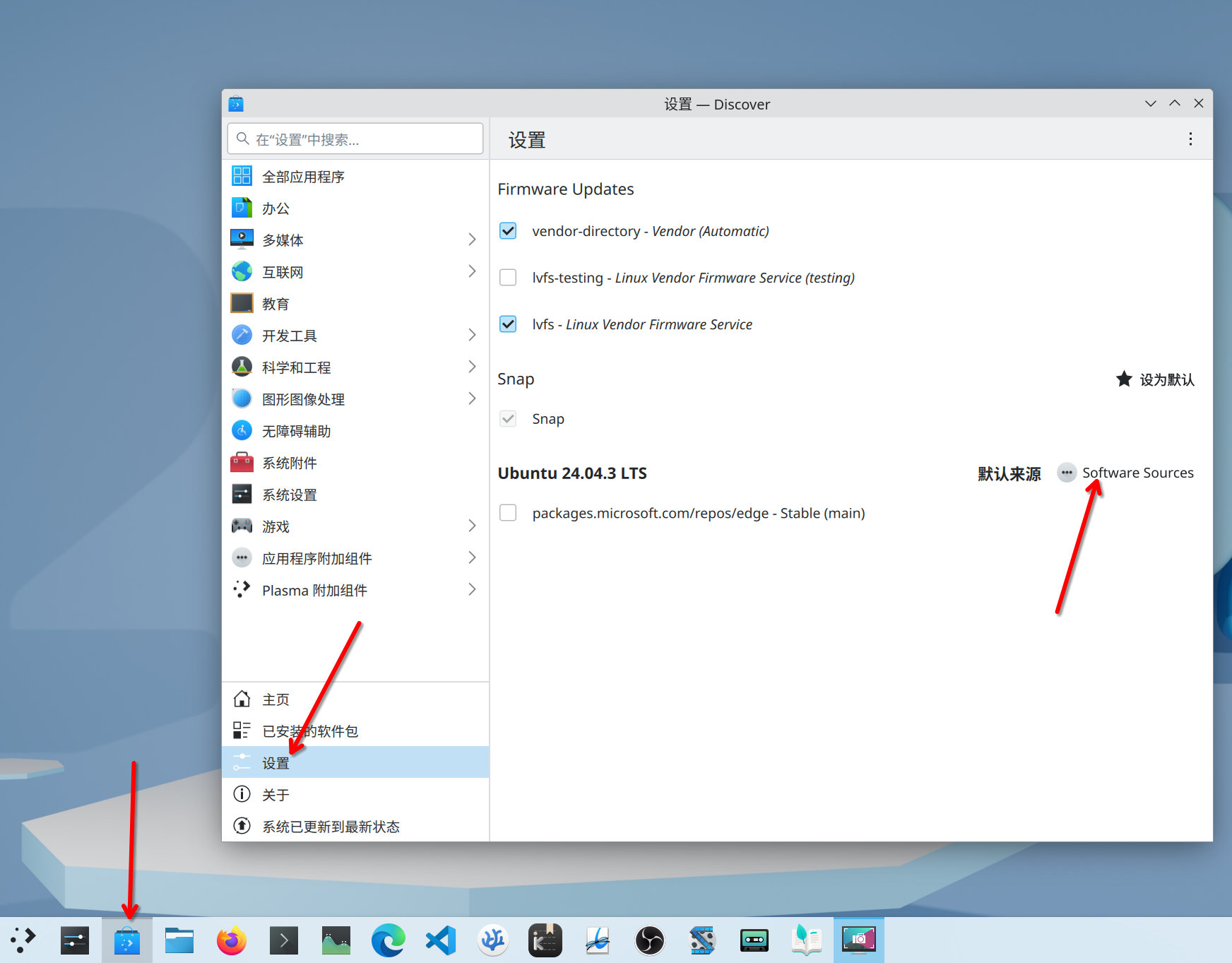 安装edge浏览器、chrome浏览器、vscode后,还会添加更新源,这个可以在如下图应用商店的设置里更改,
