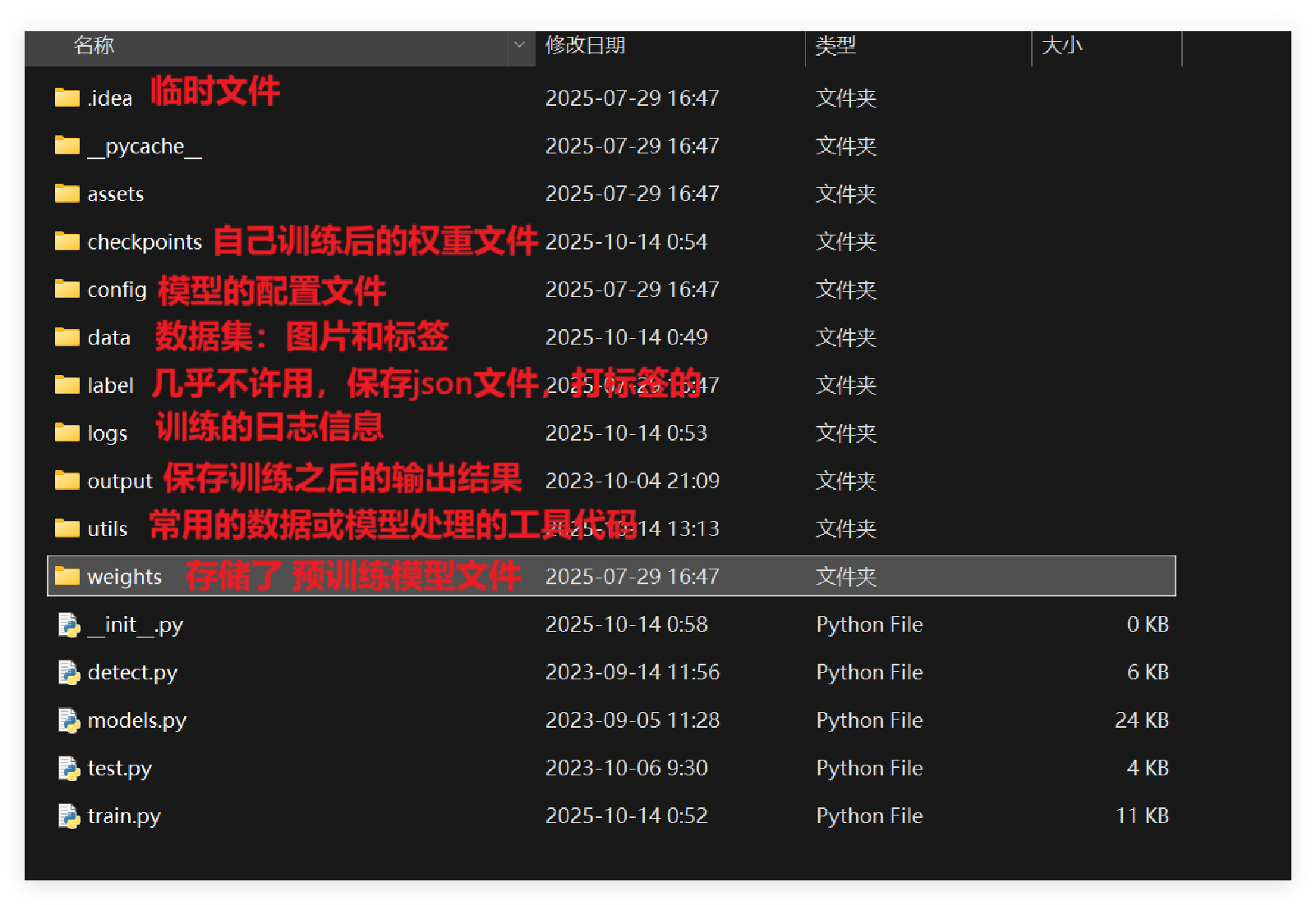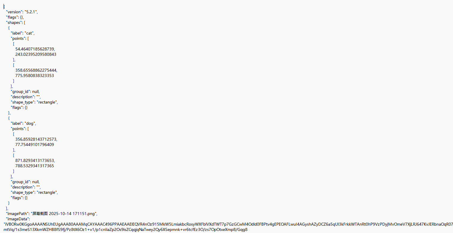 from io import BytesIOname2id = { 'dog':0, 'cat':1}#有多少个类别,在字典中就写多少个对应的就可以def convert(img_size, box):dw = 1./ (img_size[0])dh = 1./(img_size[1])x = (box[0] + box[2])/2.0 - 1y = (box[1] + box[3])/2.0 - 1w = box[2]- box[0]h = box[3] - box[1]x = x*dww = w*dwy = y*dhh = h*dhreturn (x,y,w,h)def decode_json(json_floder_path,json_name ) :#转换好的标签路径,建议保存在data\custom\labels中txt_name = r'data\\custom2\\labels\\' + json_name[0:-5] + '.txt'txt_file = open(txt_name,'w')json_path = os.path.join(json_floder_path, json_name)data = json.load(open(json_path, 'r'))img_w = data[ 'imageWidth' ]img_h = data[ 'imageHeight' ]for i in data[ 'shapes']:label_name = i['label']if ( i['shape_type' ] == 'rectangle' ):x1 = int(i['points'][0][0])y1 = int(i['points'][0][1])x2 = int(i['points'][1][0])y2 = int(i['points'][1][1])bb = (x1,y1,x2,y2)bbox = convert((img_w,img_h),bb)txt_file.write(str(name2id[label_name]) + " " +" ".join([str(a) for a in bbox]) + '\n')# 2. 提取 imageData 并解码image_data_base64 = data["imageData"]image_bytes = base64.b64decode(image_data_base64) # 解码为二进制字节流# 3. 将字节流转换为图像并保存image = Image.open(BytesIO(image_bytes)) # 从字节流加载图像save_path = r'data\\custom2\\Images\\' + json_name[0:-5] + '.png'image.save(save_path)print(f"图像已还原并保存至:{save_path}")txt_file.close()