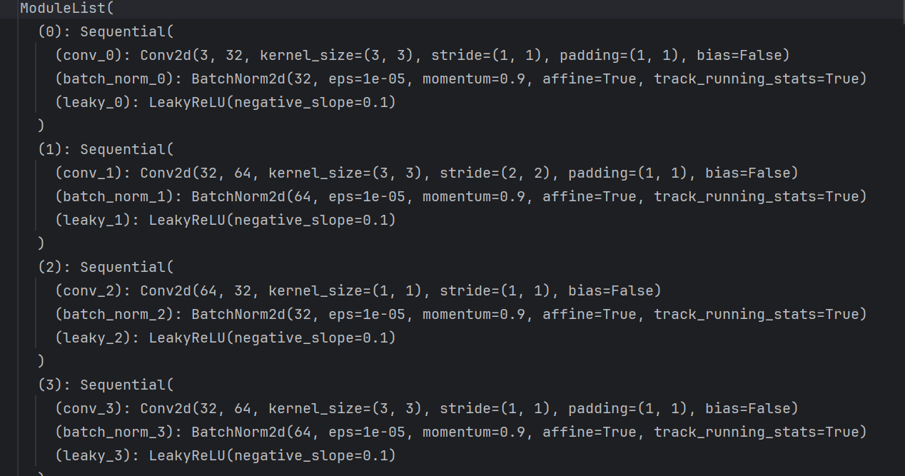 我们先创建一个列表,然后进行循环,循环的时候创建一个sequential,再往这个里面添加卷积层,池化层,和激活函数,或者yolo层,再或者残差层再把这个sequential添加到这个列表中去。