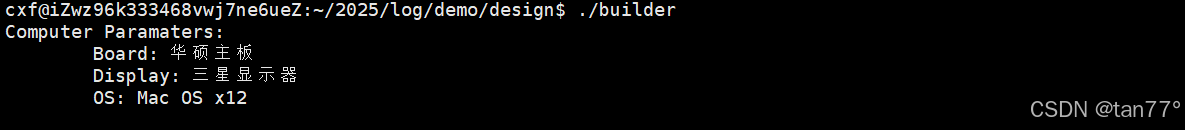 {Builder* builder = new MacBookBuilder();std::unique_ptr<Director> director(new Director(builder));director->construct("华硕主板", "三星显示器");std::shared_ptr<Computer> computer = builder->build();computer->showParamaters();return 0;