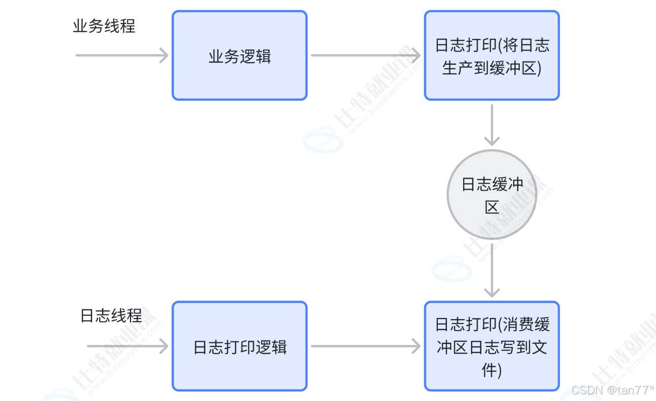 异步日志是指在进行日志输出时,日志输出语句与业务逻辑语句并不是在同一个线程中运行,而是有专门的线程用于进行日志输出操作。业务线程只需要将日志放到一个内存缓冲区中不用等待即可继续执行后续业务逻辑(作为日志的生产者),而日志的落地操作交给单独的日志线程去完成(作为日志的消费者),这是一个典型的生产 - 消费模型。