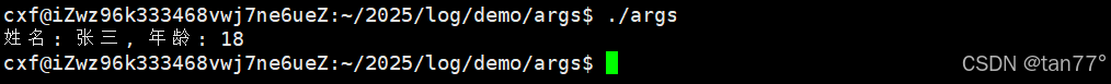 {int age = 18;std::string name = "张三";xprintf("姓名: ", name, ", 年龄: ", age);return 0;