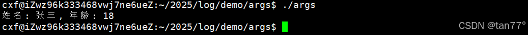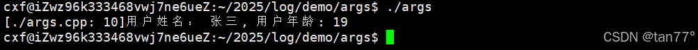 {int age = 19;std::string name = "张三";LOG("用户姓名: %s, 用户年龄: %d", name.c_str(), age);return 0;