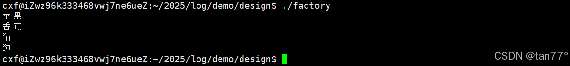 {// 先通过工厂生产者生产一个工厂,再通过这个工厂去生产产品std::shared_ptr<Factory> ff = FactoryProducer::create("水果");std::shared_ptr<Fruit> fruit = ff->getFruit("苹果");fruit->name();fruit = ff->getFruit("香蕉");fruit->name();std::shared_ptr<Factory> factory = FactoryProducer::create("动物");std::shared_ptr<Animal> animal = factory->getAnimal("猫");animal->name();animal = factory->getAnimal("狗");animal->name();return 0;