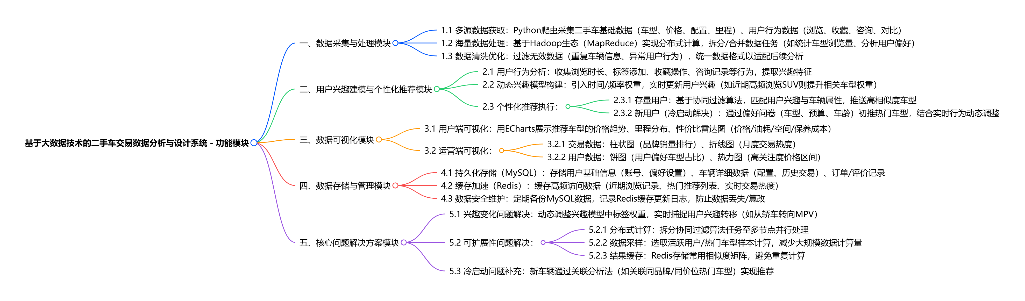 基于大数据技术的二手车交易数据分析与设计系统,核心功能围绕解决二手车交易平台信息不对称、海量数据检索难、用户个性化需求难满足等问题展开,具体可概括为: