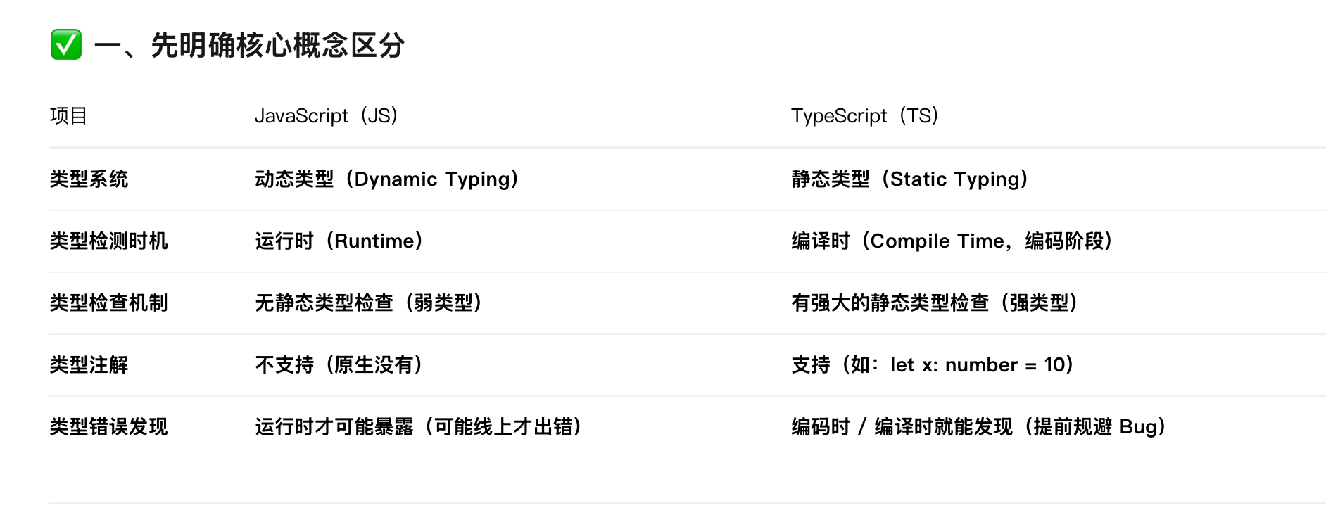 1. JavaScript 是动态类型语言,没有编译时类型检查 | 变量类型在运行时才能确定,容易因类型错误引发 bug,且难以提前发现 | ✅ TS 引入了 静态类型系统,可以在编码阶段发现类型不匹配等问题 |