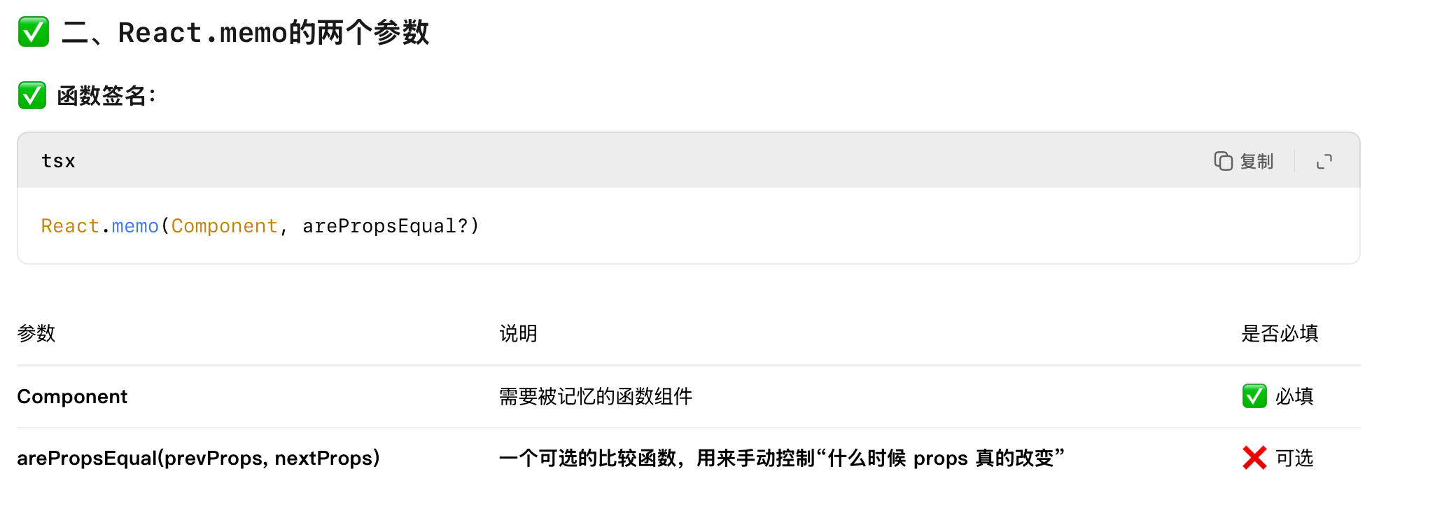 1. 使用 React.memo(不传第二个参数) | 默认对 props 进行浅比较,避免不必要的渲染 | props 是基本类型,或引用稳定的对象 |
