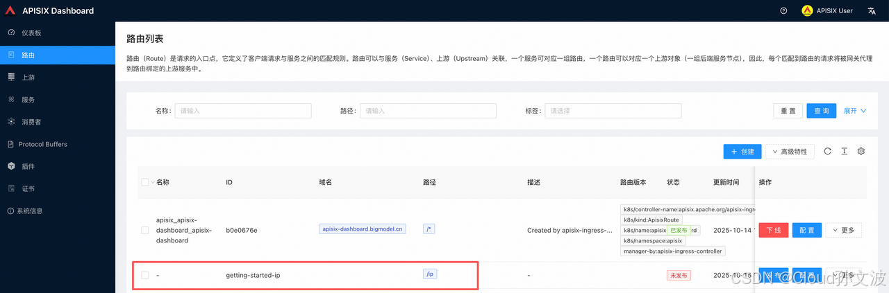转发至 httpbin.org/ip:curl -i "http://10.244.211.134:9180/apisix/admin/routes" -H "X-API-KEY: edd1c9f034335f136f87ad84b625c8f1" -X PUT -d '