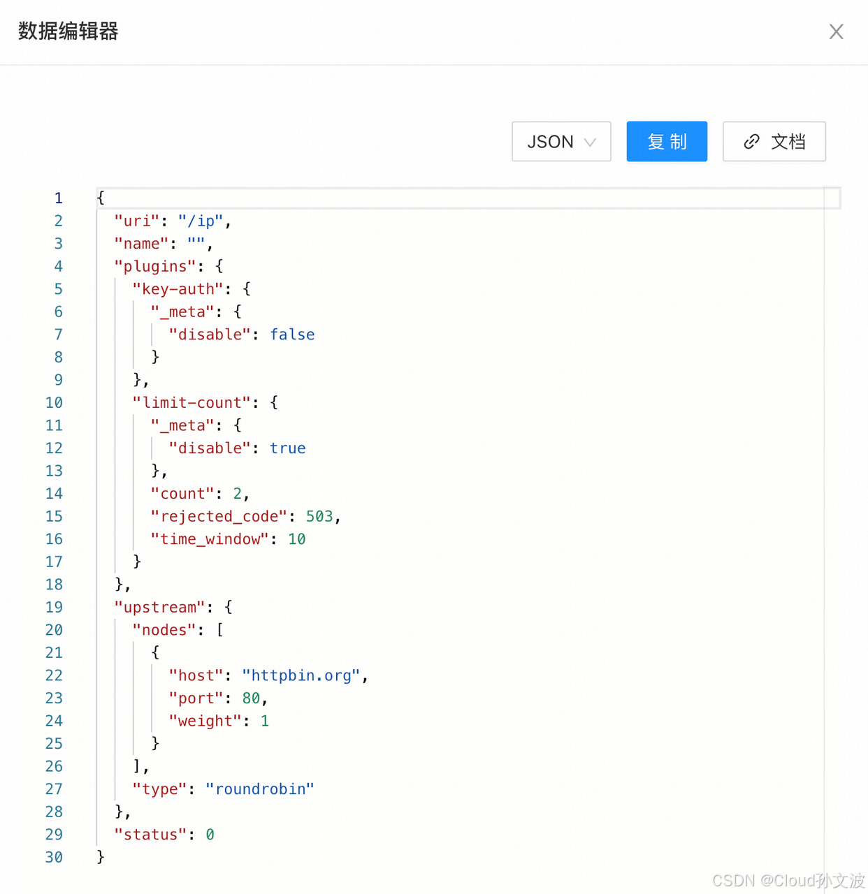 {"id": "getting-started-ip","uri": "/ip","upstream": {"type": "roundrobin","nodes": {"httpbin.org:81": 1 # 这里我故意将80端口改成了 81 }}