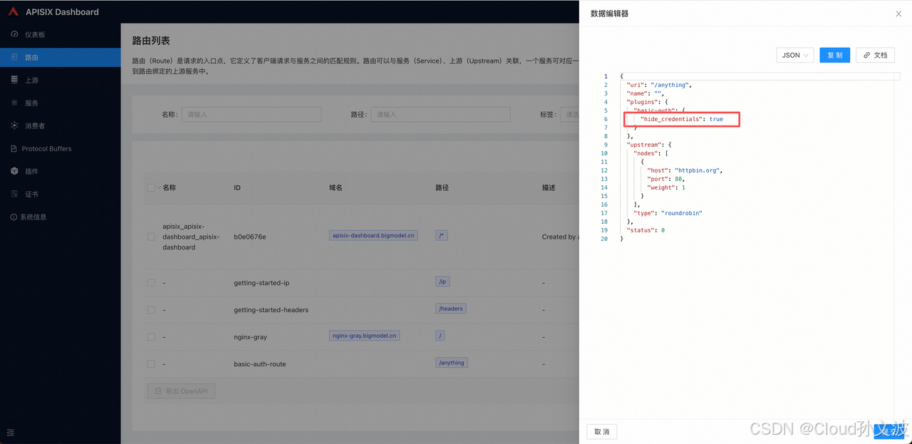 -d '{"id": "basic-auth-route","uri": "/anything","plugins": {"basic-auth": {"hide_credentials": true}},"upstream": {"type": "roundrobin","nodes": {"httpbin.org:80": 1}}
