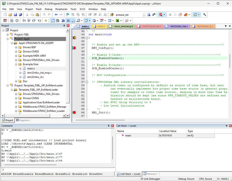 3. 此时KEIL Debugger会停在Application工程 main函数的入口。可以正常设置 断点,及使用其它Debug功能,如下图5所示。
