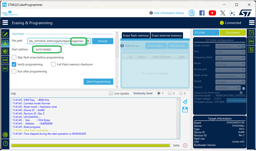 然后我们编译Appliction工程,并将生成的Appli.bin烧录到外部FLASH,如下图3 所示。注意我们这里是为了加快调试速度,烧录前没有进行签名,实际工程中需要对 FSBL与Application进行签名。