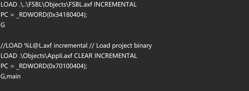 在\Template_FSBL_XIP\MDK-ARM\Appli目录下创建App.ini文件,编辑并加入下 面脚本。该脚本首先加载FSBL,然后设置内核PC寄存器为FSBL入口地址 0x34180400+4,运行FSBL后,可以通过暂停Debugger再次加载应用进行调试。