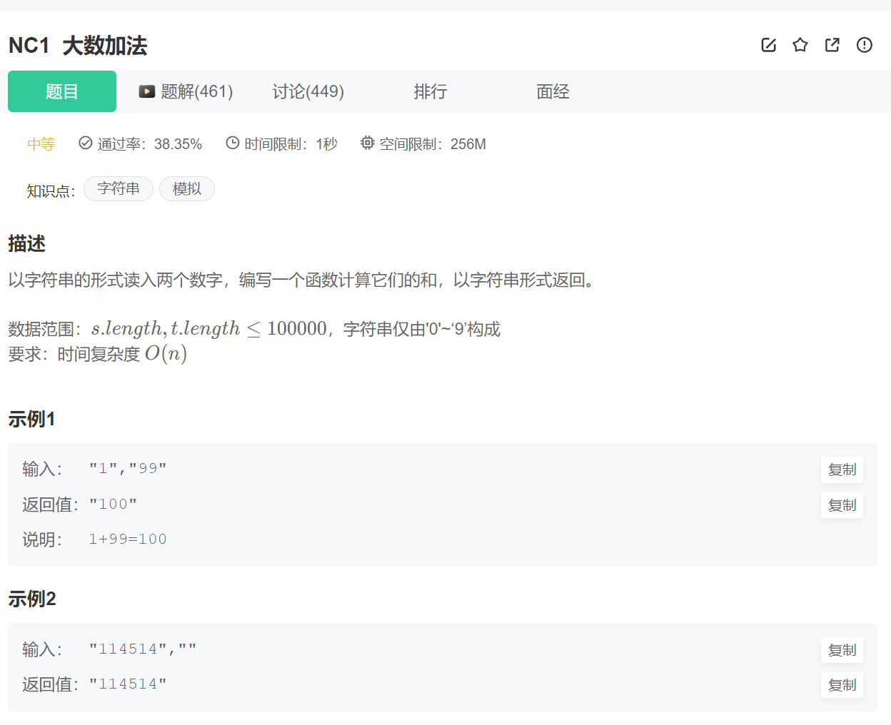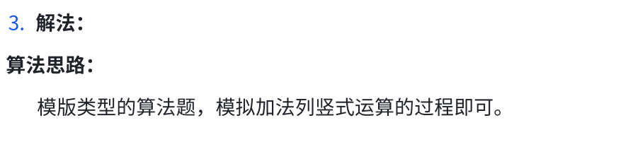 public:/*** 代码中的类名、方法名、参数名已经指定,请勿修改,直接返回方法规定的值即可** 计算两个数之和* @param s string字符串 表示第一个整数* @param t string字符串 表示第二个整数* @return string字符串*/string solve(string s, string t) {// write code herestring ret;int i = s.size() - 1, j = t.size() - 1;int tmp = 0;while (i >= 0 || j >= 0 || tmp){if (i >= 0){tmp += s[i--] - '0';}if (j >= 0){tmp += t[j--] - '0';}ret += tmp % 10 + '0';tmp /= 10;}reverse(ret.begin(), ret.end());return ret;}