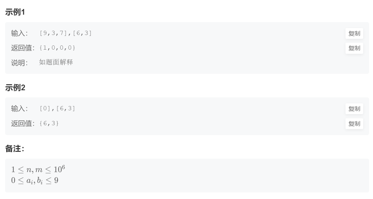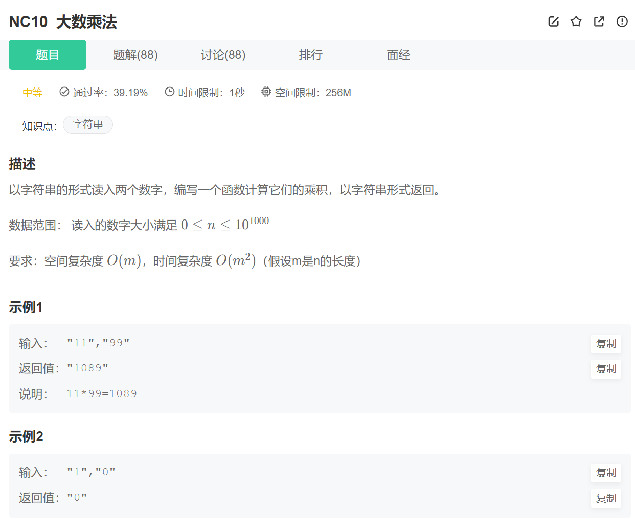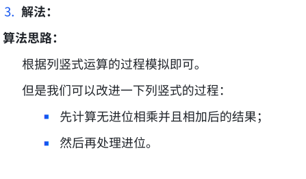public:/*** 代码中的类名、方法名、参数名已经指定,请勿修改,直接返回方法规定的值即可** * @param s string字符串 第一个整数* @param t string字符串 第二个整数* @return string字符串*/string solve(string s, string t) {// write code herereverse(s.begin(), s.end());reverse(t.begin(), t.end());int m = s.size(), n = t.size();vector<int> tmp(m + n);// 1. 无进位相乘相加for(int i = 0; i < m; i++){for(int j = 0; j < n; j++){tmp[i + j] += (s[i] - '0') * (t[j] - '0');}}// 2. 处理进位int c = 0;string ret;for(auto x : tmp){c += x;ret += c % 10 + '0';c /= 10;}while(c){ret += c % 10 + '0';c /= 10;}// 3. 处理前导零while(ret.size() > 1 && ret.back() == '0') ret.pop_back();reverse(ret.begin(), ret.end());return ret;}