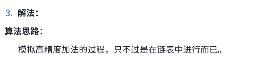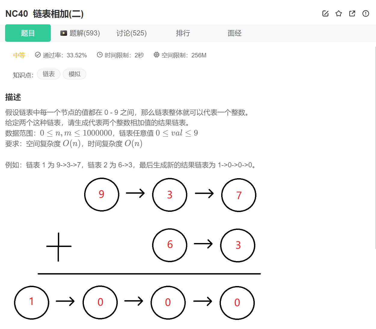 public:/*** 代码中的类名、方法名、参数名已经指定,请勿修改,直接返回方法规定的值即可** * @param head1 ListNode类 * @param head2 ListNode类 * @return ListNode类*/ListNode* reverse(ListNode* head){ListNode* newhead = new ListNode(0);ListNode* cur = head;while (cur){ListNode* next = cur->next;cur->next = newhead->next;newhead->next = cur;cur = next;}cur = newhead->next;delete newhead;return cur;}ListNode* addInList(ListNode* head1, ListNode* head2) {// write code herehead1 = reverse(head1);head2 = reverse(head2);int t = 0;ListNode* cur1 = head1;ListNode* cur2 = head2;ListNode* ret = new ListNode(0);ListNode* prev = ret;while (cur1 || cur2 || t){if (cur1){t += cur1->val;cur1 = cur1->next;}if (cur2){t += cur2->val;cur2 = cur2->next;}prev = prev->next = new ListNode(t % 10);t /= 10;}cur1 = ret->next;ret->next = nullptr;delete ret;return reverse(cur1);}