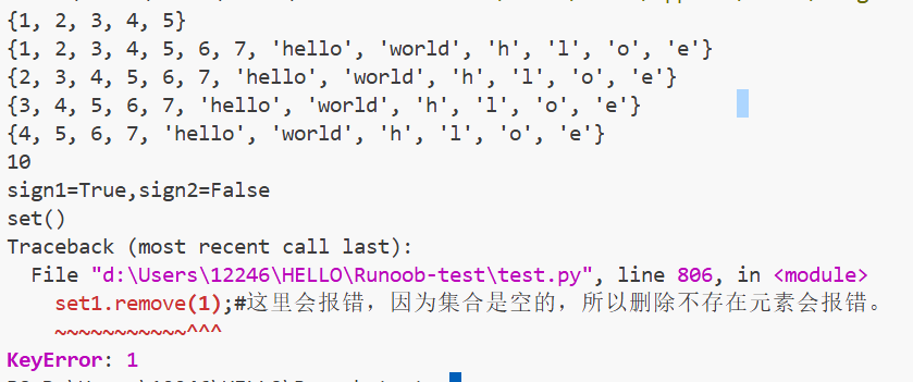 #直接添加字符串那个,最好集合中只有一个 l ,因为集合对重复元素只保存一个。 set1.remove(1);#删除,删除不存在元素会报错。这里不尝试,一会下面尝试