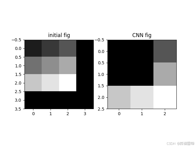 plt.figure() plt.subplot(121) # 先输出一下原始图像 plt.imshow(input_image, cmap='gray', vmin=0, vmax=9) plt.title('initial fig') plt.subplot(122) # 先输出一下原始图像 plt.imshow(output_image, cmap='gray', vmin=0, vmax=9) plt.title('CNN fig')plt.show()