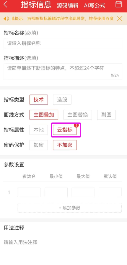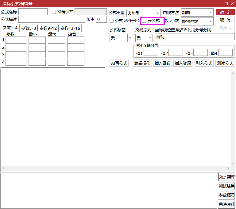 PC,Ctrl+F打开公式编辑界面,新建指标过程中勾选“云公式”