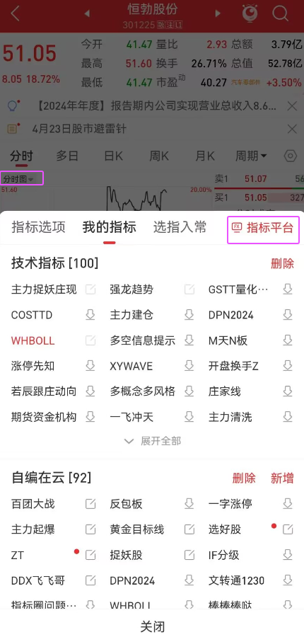APP,K线或者分时里指标下拉打开的指标选项弹窗界面--我的指标--自编在云