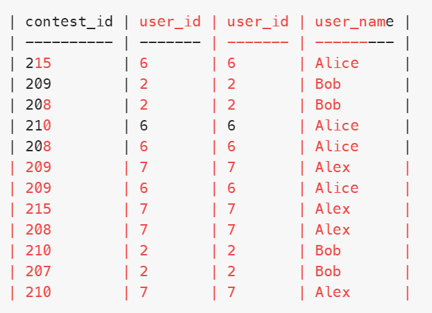 select r.contest_id, round(100*count(*)/u.total, 2) percentagefrom Register rcross join (select count(*) total from Users) ugroup by r.contest_idorder by percentage desc, r.contest_id