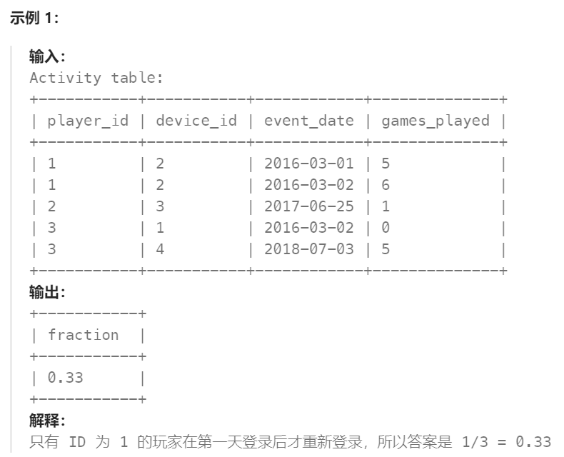 这题主要是求首次登录游戏且第二天依然连续登录游戏的人的所占总用户的比率。