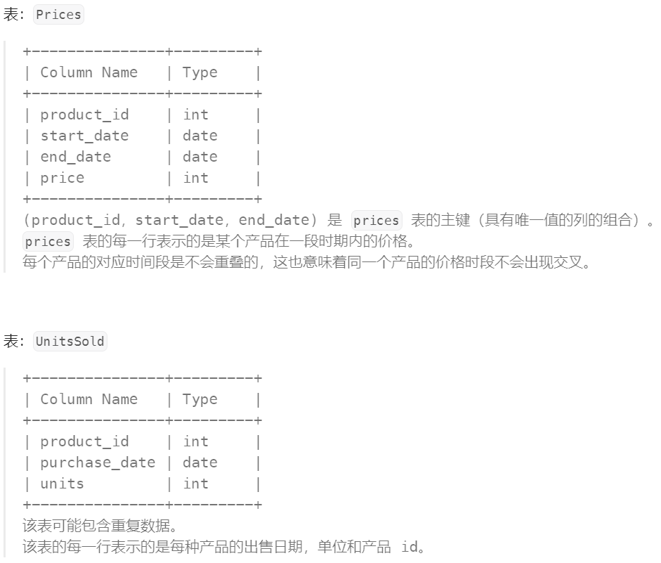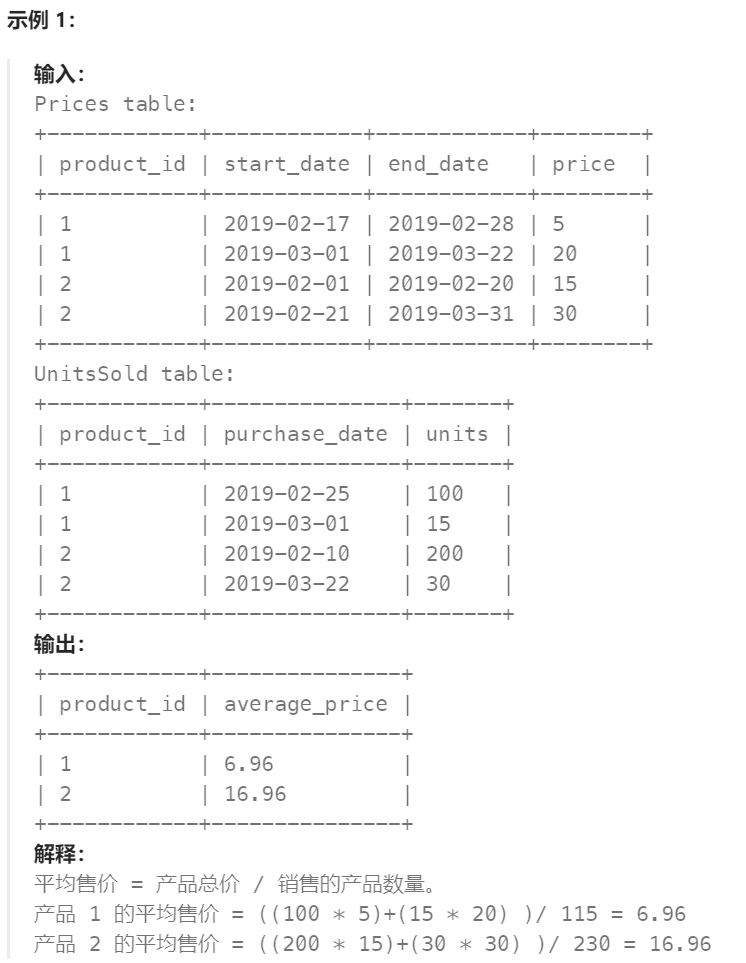 应该 四舍五入到小数点后两位。如果产品没有任何售出,则假设其平均售价为 0。