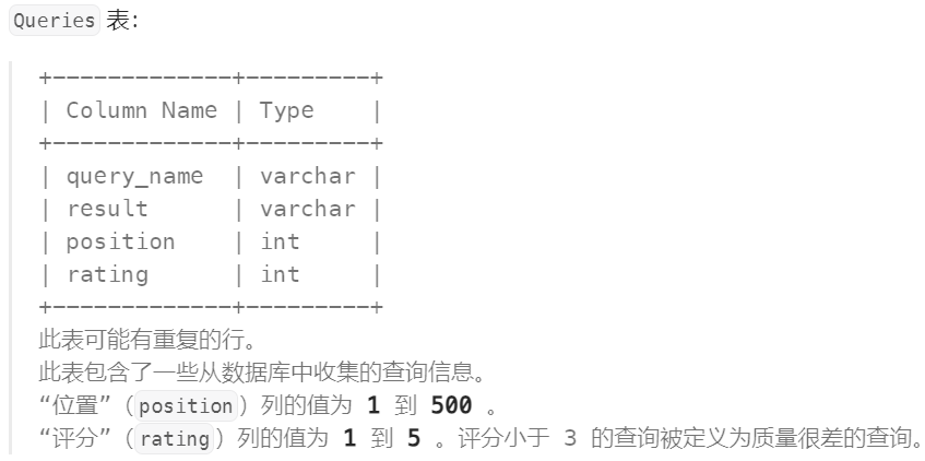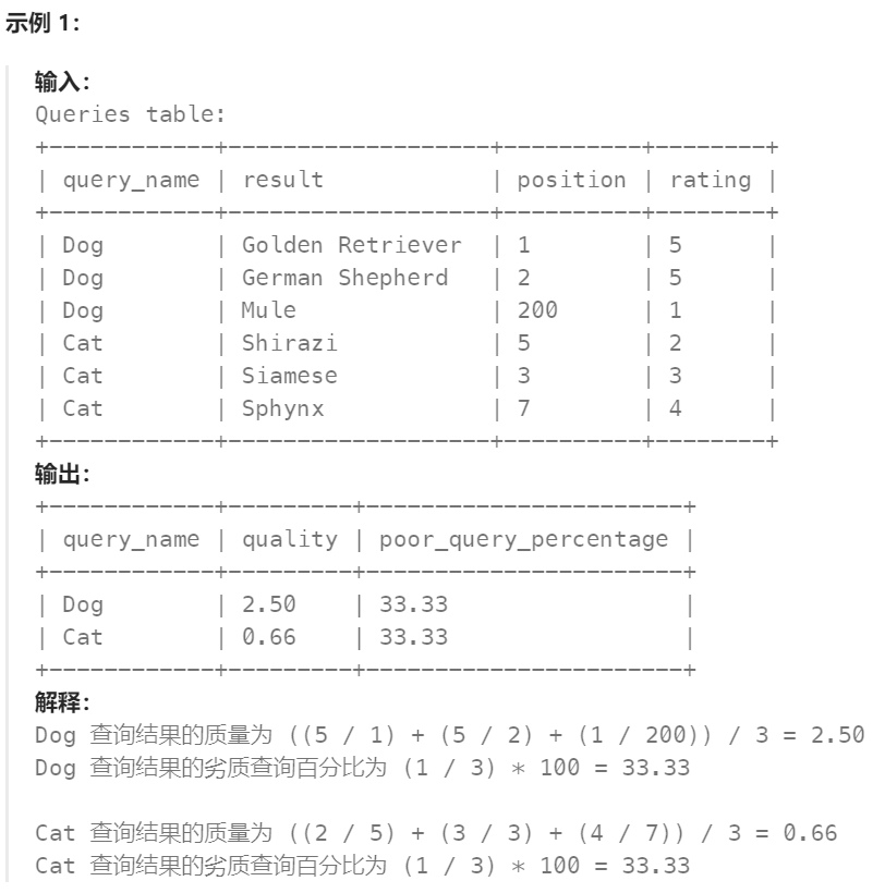 这里题目看着复杂,其实看样例基本就懂了,就是先按name分组,然后按要求计算平均值,第一个要求是先求每行数据的rating/position比值,然后按组来分别计算该值的平均值,第二个要求是求出每组的rating<3的行的比率,使用avg(if(...))即可