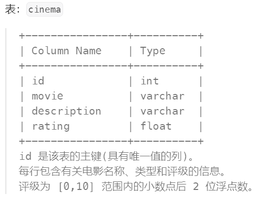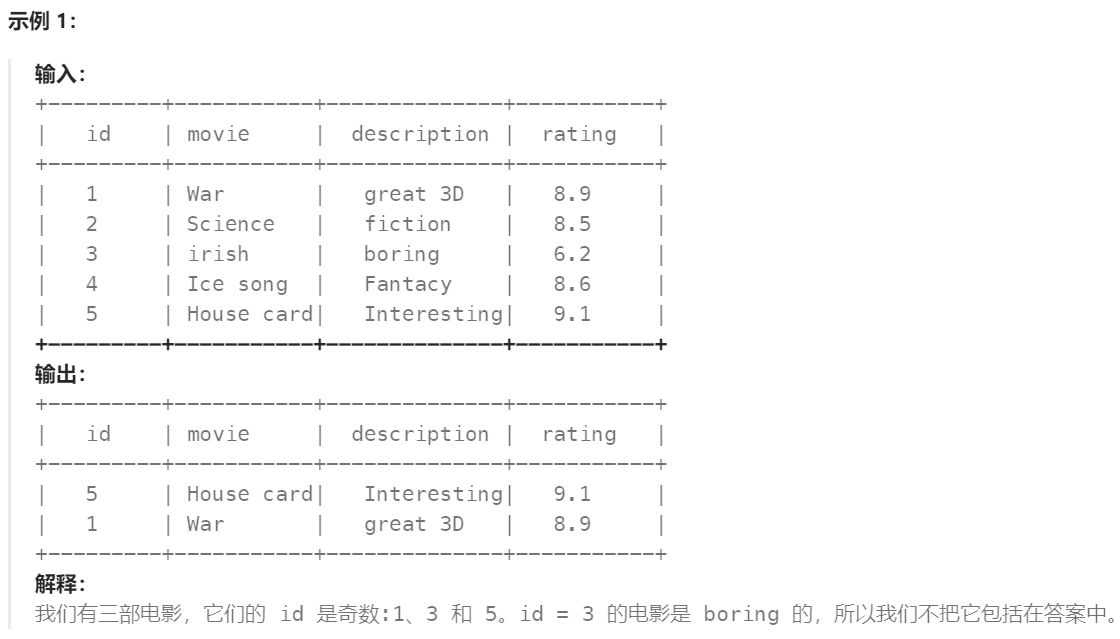 select *from cinemawhere description <> 'boring'and id&1order by rating desc