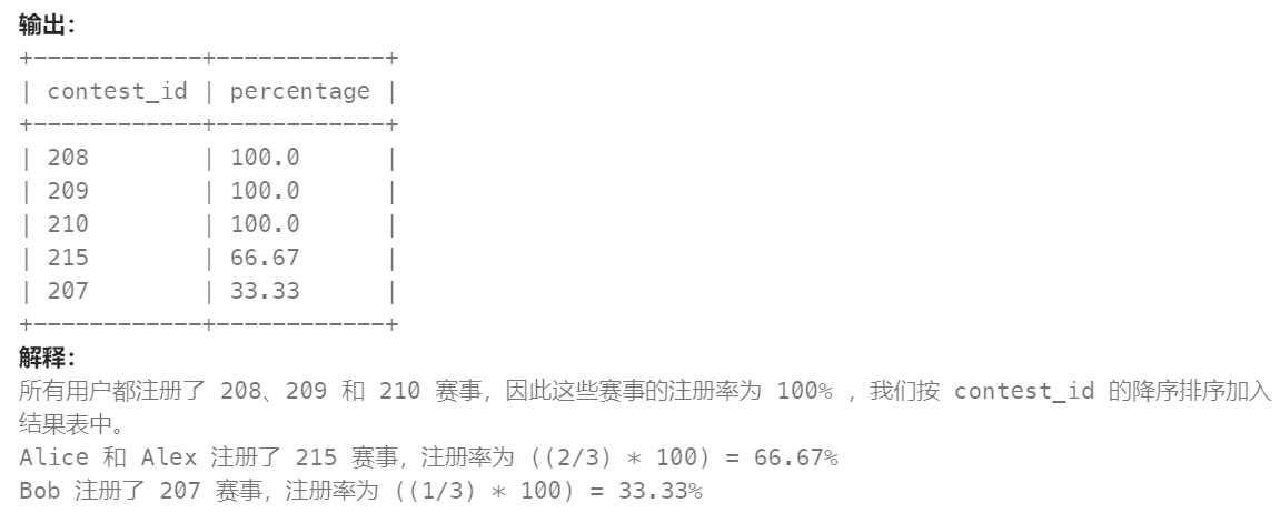 select contest_id, round(count(*)/(select count(*) from Users) * 100, 2) percentagefrom Registergroup by contest_idorder by percentage desc, contest_id