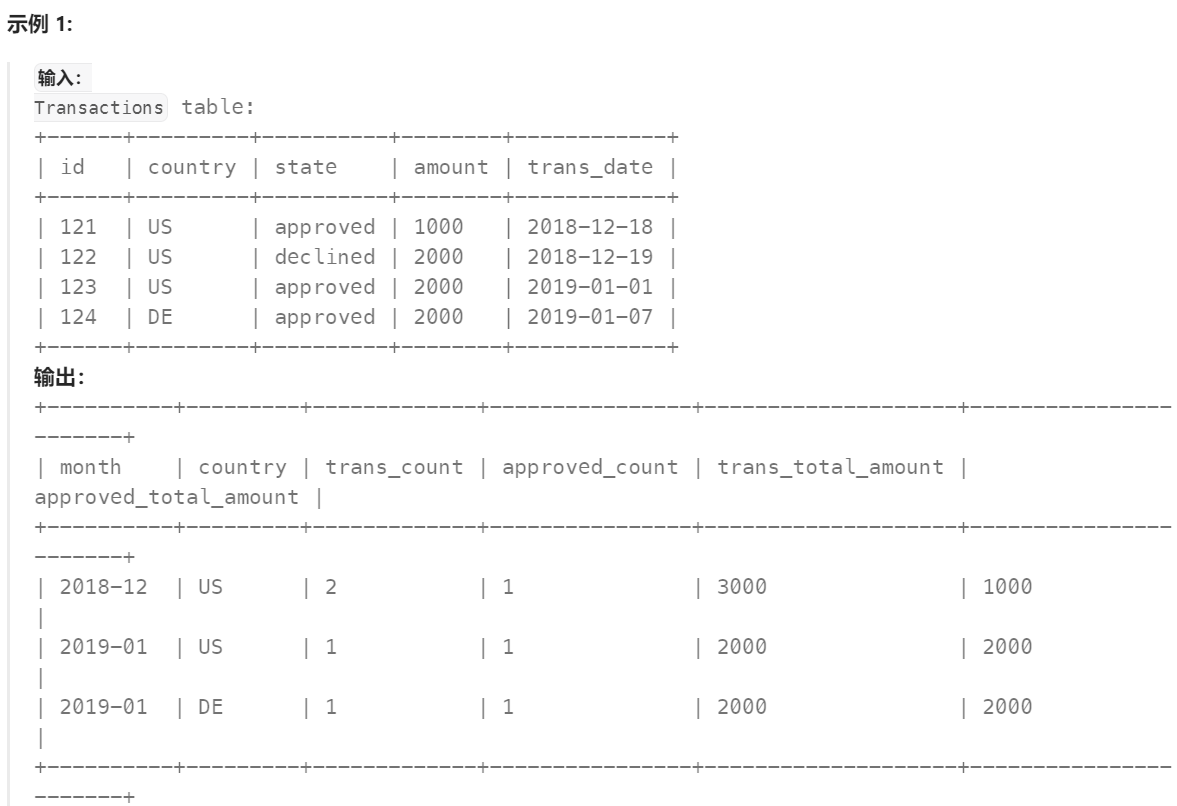 编写一个 sql 查询来查找每个月和每个国家/地区的事务数及其总金额、已批准的事务数及其总金额。
