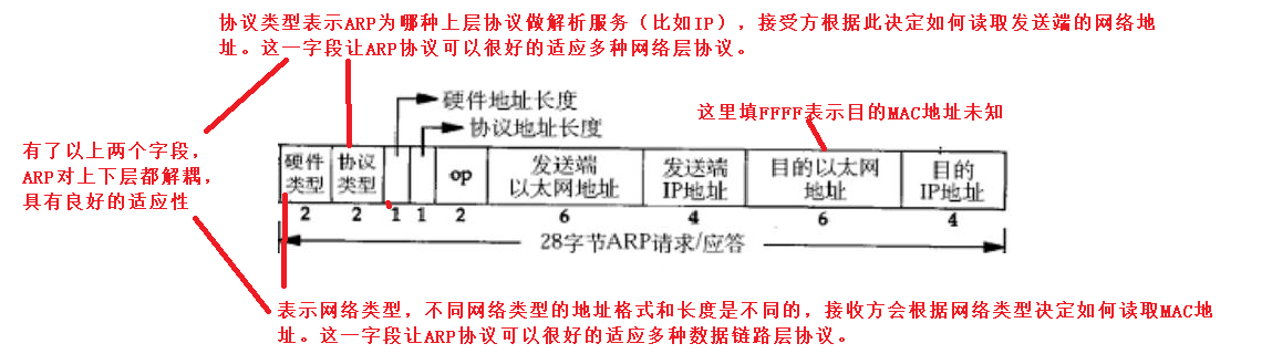 硬件地址长度字段和协议地址长度字段看似多余(因为已经有了类型字段,而通过类型就可以知道长度),但是这正是ARP协议良好适应性的体现,他可以兼容未来可能出现的一种网络/协议类型,而这种类型的地址长度是不固定的