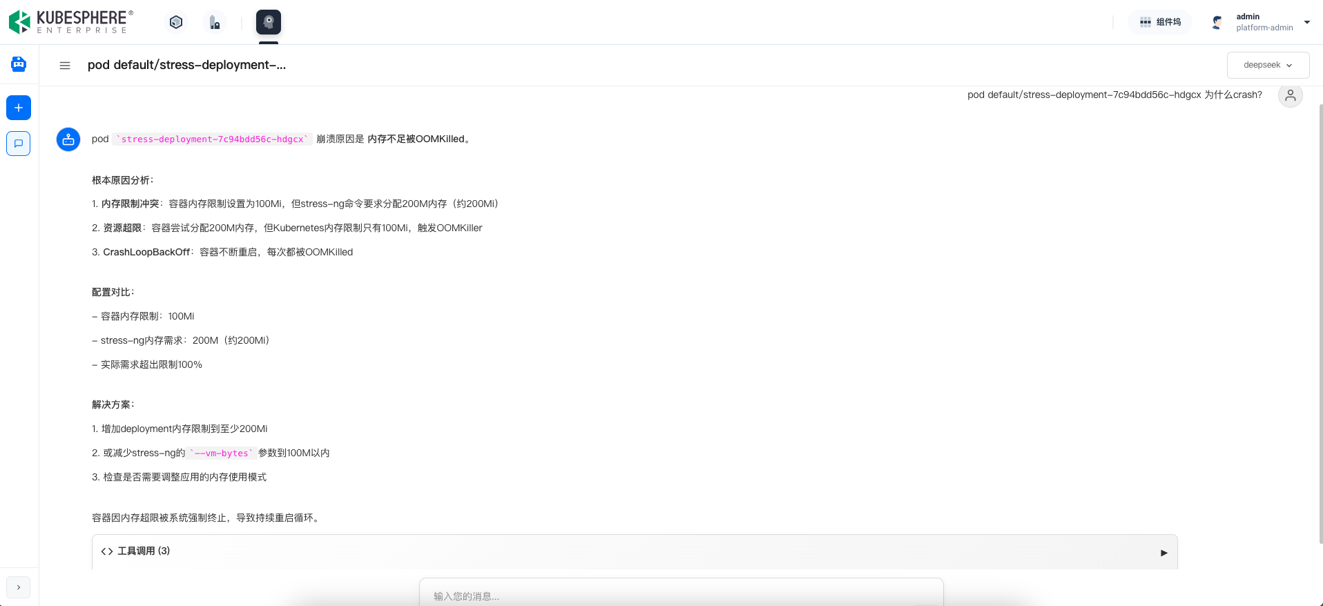 完成以上步骤后,即可在 KubeSphere 环境中体验 HolmesGPT 的强大功能。