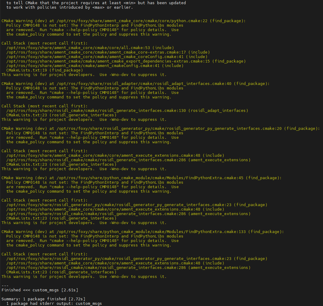 find_package(rosidl_default_generators REQUIRED)rosidl_generate_interfaces(custom_msgssrv/PlannerPlanPath.srvmsg/Pose.msgmsg/ShapeBox.msgmsg/MotCmd.msgDEPENDENCIESbuiltin_interfaces