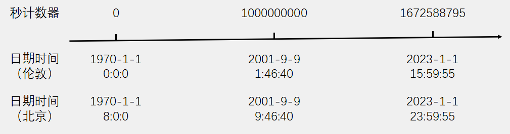 一个时间轴,从时间戳0开始一直计时,储存在一个永不进位的秒计时器里面,然后,将通过一系列复杂的计算(C语言官方设计的time函数已经完成了这些计算)得到伦敦时间,然后,以此得到各地的时间
