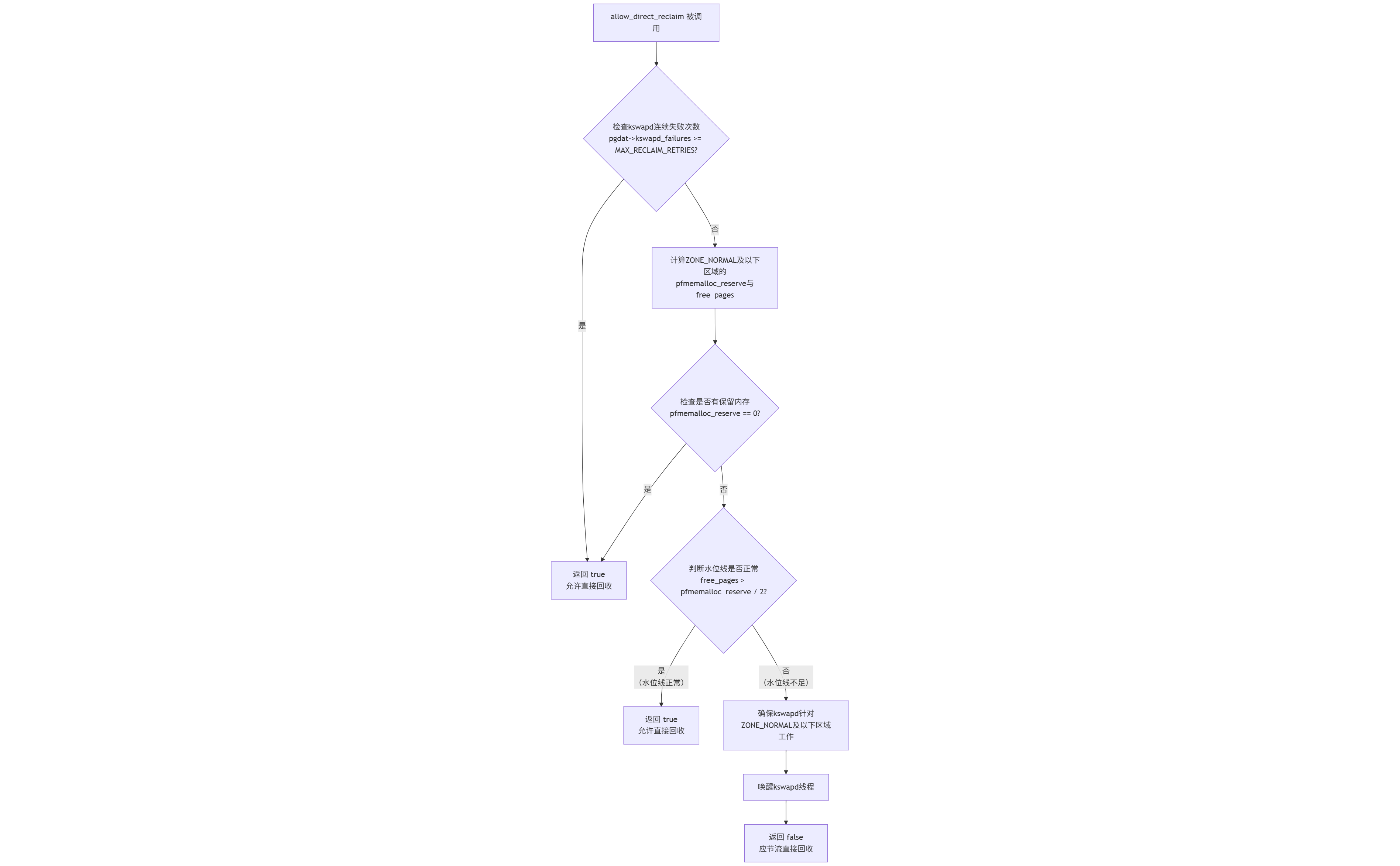 。如果失败次数过多,意味着后台异步回收机制可能已经失效,系统内存压力巨大。此时函数会返回if (pgdat->kswapd_failures >= MAX_RECLAIM_RETRIES)