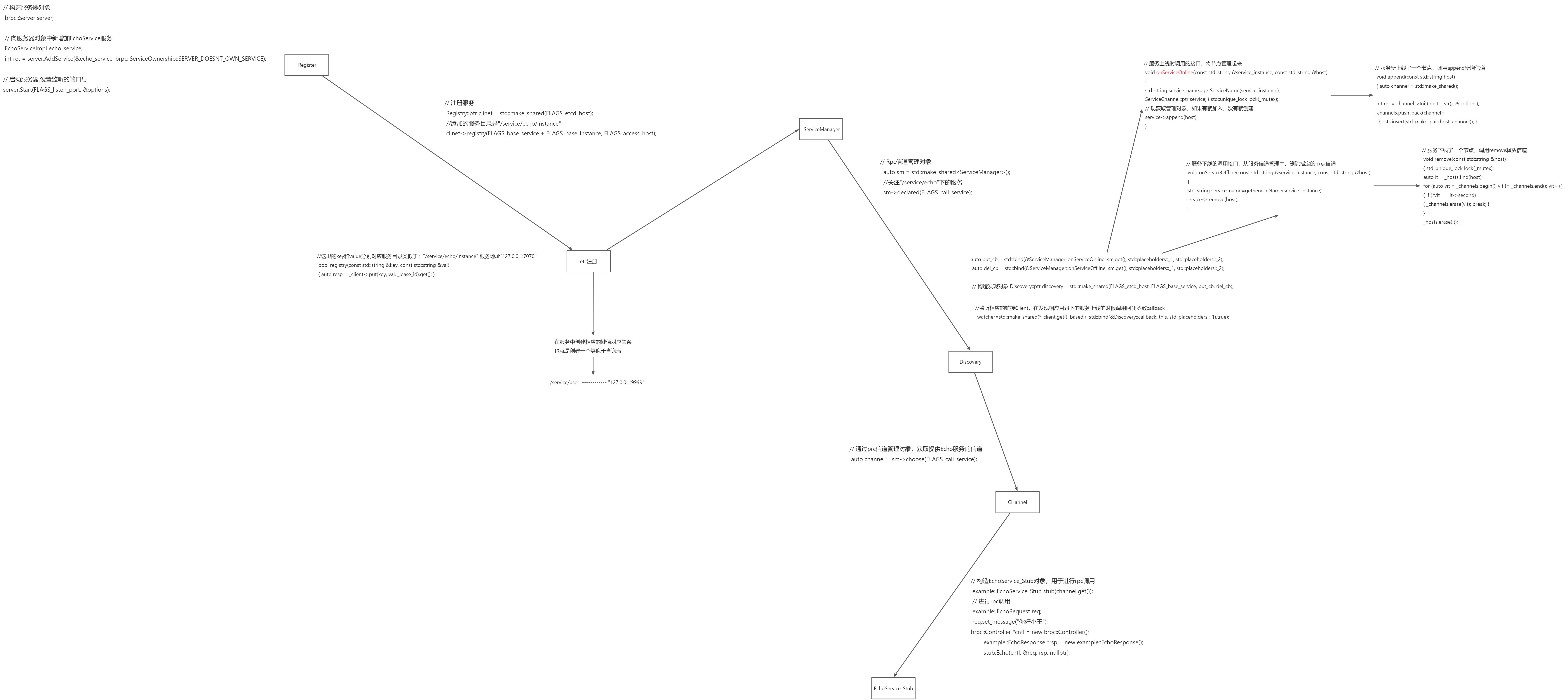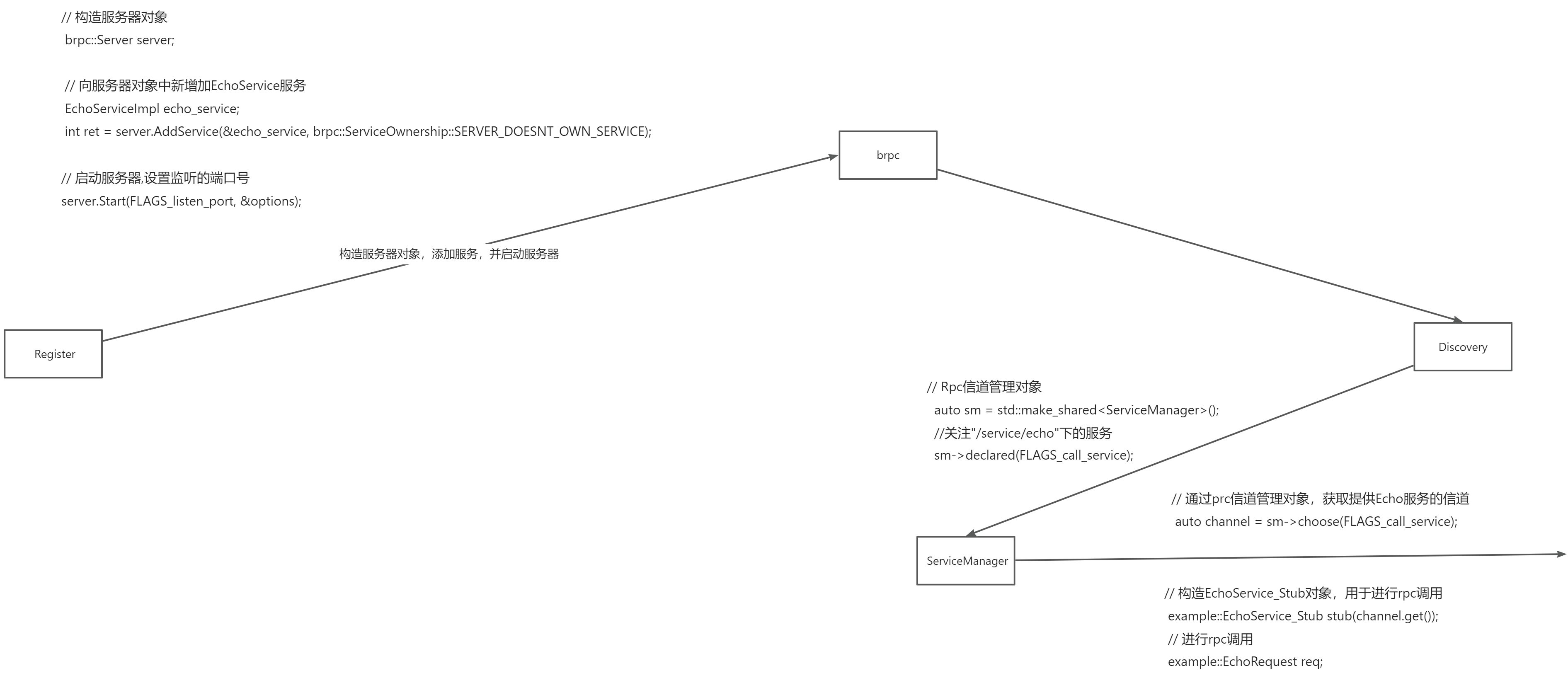 Discovery: 创建 brpc 管理对象,之后创建 etcd 监听,监听到服务后,根据服务类型调用相应的回调函数,这里的回调函数会创建响应的 brpc 信道(结合的关键),之 后通过brpc信道管理对象,获取提供Echo服务的信道,进行相应的 rpc 调用
