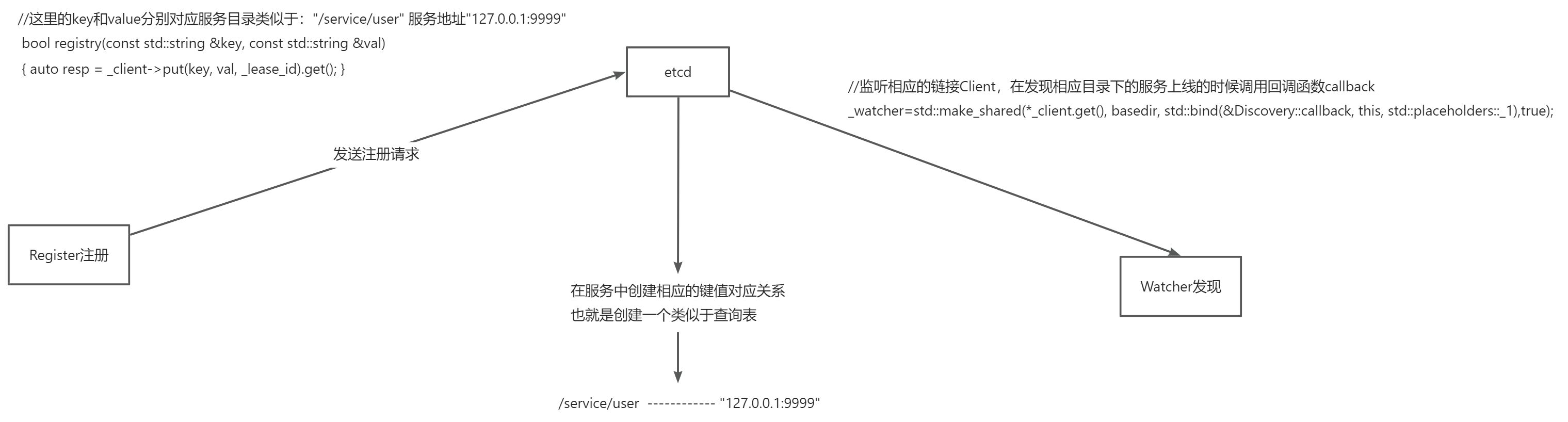 {public:using ptr = std::shared_ptr<Registry>;Registry(const std::string &host) : _client(new etcd::Client(host)),_keepalive(_client->leasekeepalive(10).get()),_lease_id(_keepalive->Lease()){}~Registry() {}//这里的key和value分别对应服务目录"/service/user" 服务地址"127.0.0.1:9999"bool registry(const std::string &key, const std::string &val){auto resp = _client->put(key, val, _lease_id).get();}private:std::shared_ptr<etcd::Client> _client;std::shared_ptr<etcd::KeepAlive> _keepalive;uint64_t _lease_id;