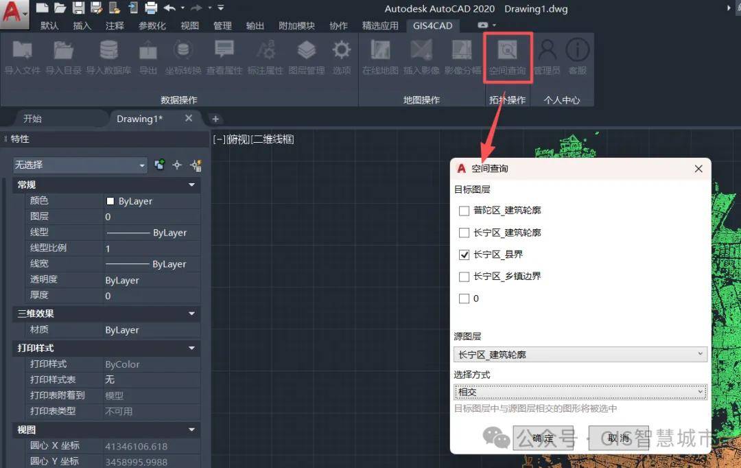 2.在GIS4CAD菜单上,打开“空间查询”窗口,选择要查询的图层和用于查询的图层,并选择查询方式;