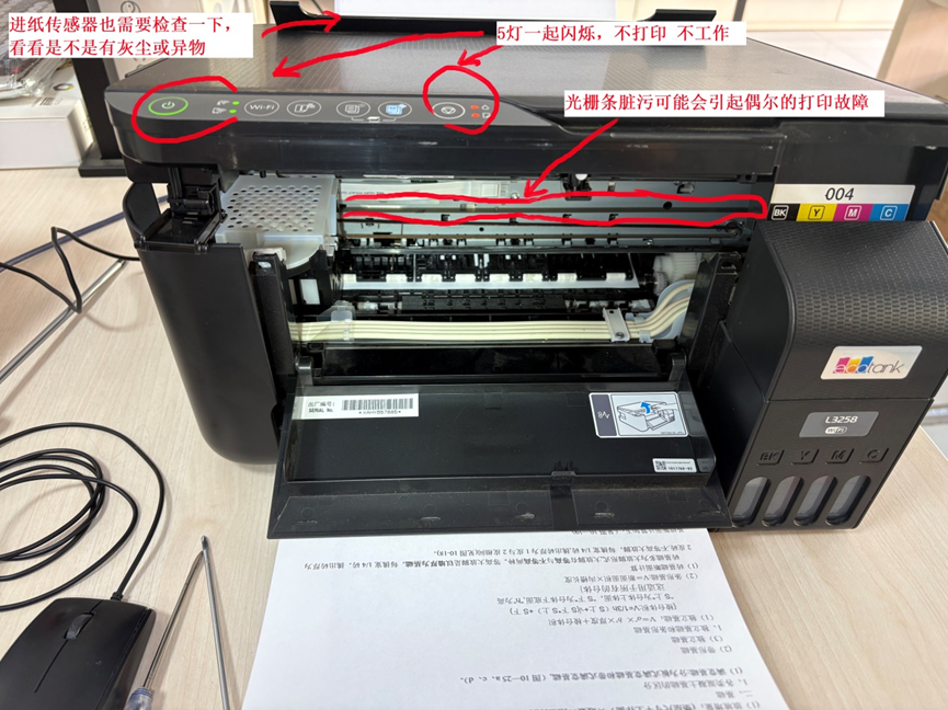 出现了这种情况,于是又把这台爱普生L3258打印机送回了站内进行再次的检修,接电、打开打印机电源,发现竟然还是5灯一起闪烁,关闭打印机电源,打开打印机前门,拧下前门左侧的一颗螺丝,提前扫描部分拔下3条排线,拆下扫描部分;拧下固定搓纸轮固定卡上的那颗螺丝,取下固定卡上的小弹簧,清理一下进纸传感器,清理完成后装回搓纸轮固定卡以及那个小弹簧,然后在清理一下字车后面的那个光栅条(光栅传感器),清理干净后,按原样安装回打印机的所有组件 ,再次接电、开机、连接电脑,打印测试页,打印测试页正常,打印测试文档,连续打印测试文档后正常,故障未见;维修完成,通知用户取机;