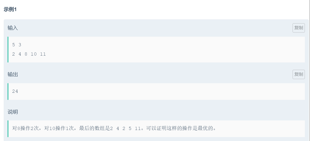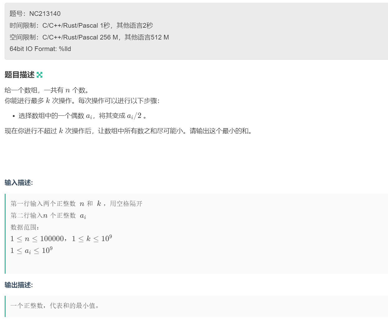 {int n, k;cin >> n >> k;priority_queue<int> q;int x;long long int sum = 0;for (int i = 0; i < n; i++){cin >> x;if (x % 2 == 1){sum += x;}else{q.push(x);}}while (k-- && q.size()){x = q.top();q.pop();x /= 2;if (x % 2 == 1){sum += x;}else{q.push(x);}}while (q.size()){sum += q.top();q.pop();}cout << sum << endl;return 0;