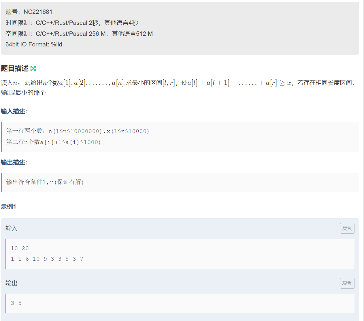 {int n, m;cin >> n >> m;for (int i = 1; i <= n; i++){cin >> a[i];}int sum = 0;int l = 0, r = 0;int len = 0x3f3f3f3f;int ll = 0, rr = 0;while (r <= n){sum += a[r];while (sum >= m){if (r - l + 1 < len){ll = l;rr = r;len = r - l + 1;}sum -= a[l];l++;}r++;}cout << ll << " " << rr << endl;return 0;