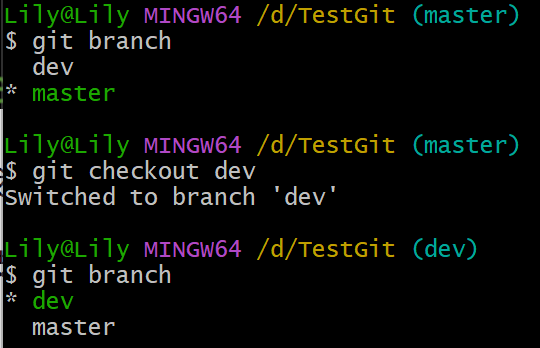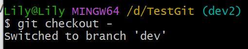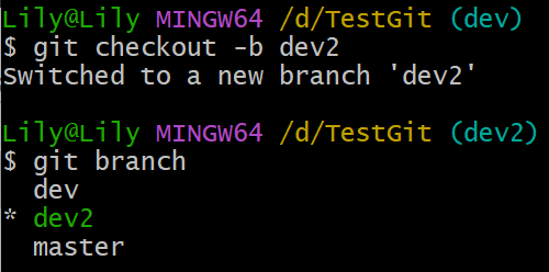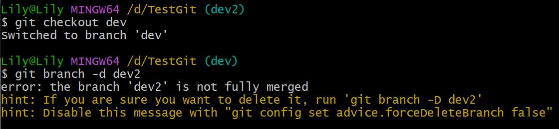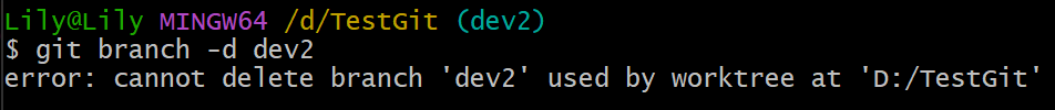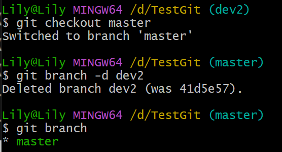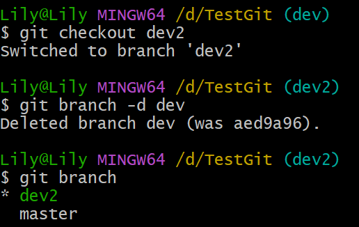 我们发现dev2发生了变化,此时它和master分支不是一样的,没有合并不能删除。如果要强制删除可以git branch -D dev2