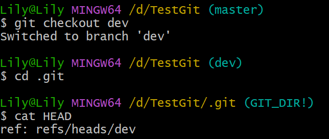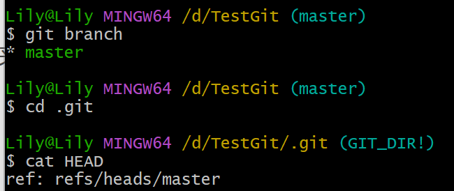 当我们进入.git文件夹查看HEAD的内容的时候可以看到,所处分支不同内部的文件指向就不同。